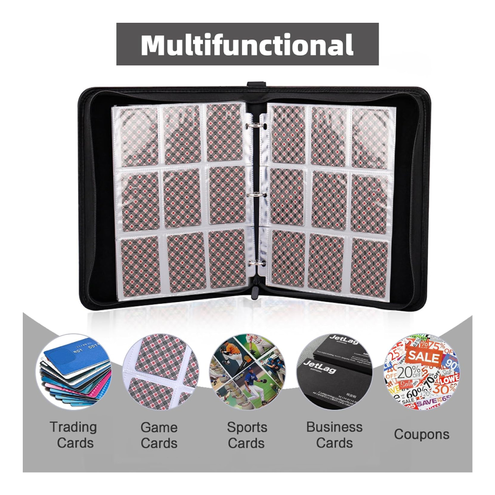 - Multi-protección: Este portatarjetas adopta un diseño de cremallera cerrada para evitar que las tarjetas se caigan. Las hojas protectoras están hechas de un material grueso, impermeable al agua, a prueba de polvo y humedad, que protege eficazmente las tarjetas de desvanecimiento y manchas.