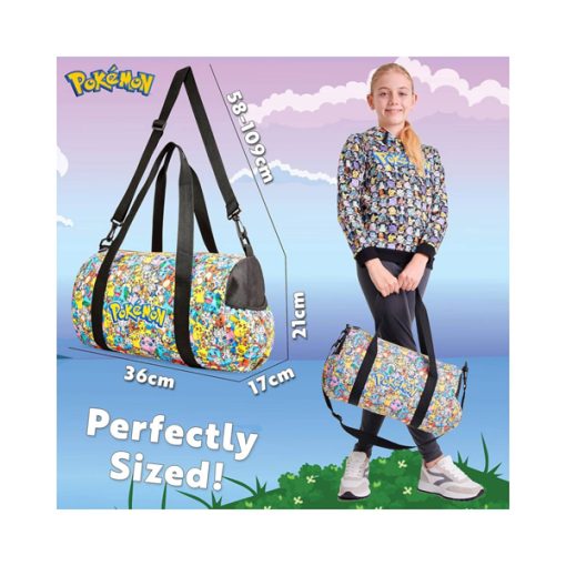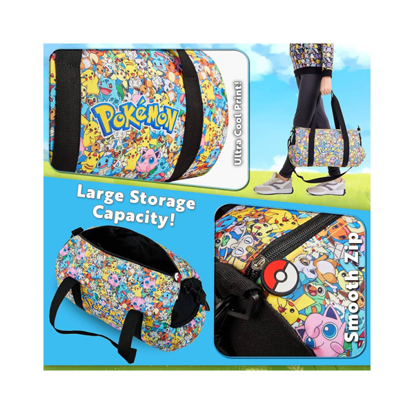 - Estarán listos para emprender cualquier aventura con esta bolsa de viaje Pokemon para niños. No solo se ve súper genial, sino que también es increíblemente práctico, con 1 compartimento principal grande con cremallera y 2 prácticos bolsillos en cada extremo. También hay 2 asas y una correa ajustable para llevarlo cómodamente