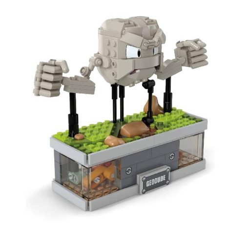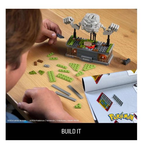 Construye el modelo y presiona el botón oculto para ver los puños de Geodude moverse hacia arriba y hacia abajo. Con 5 pulgadas de alto, este juego es ideal para tu escritorio o mesita de noche. Combínalo con otros juegos de Mini Motion o Motion estándar para una impresionante colección de Pokémon con MEGA.