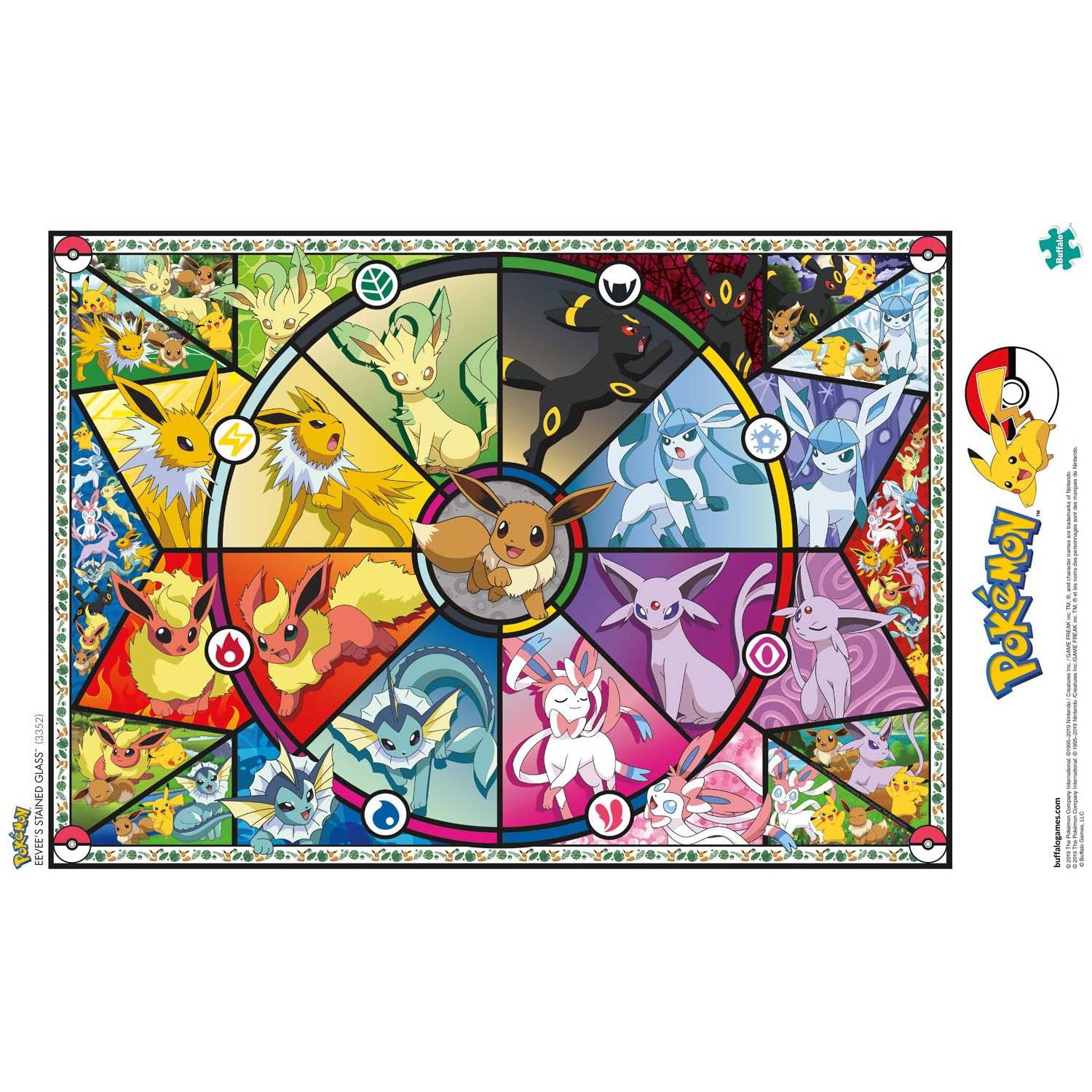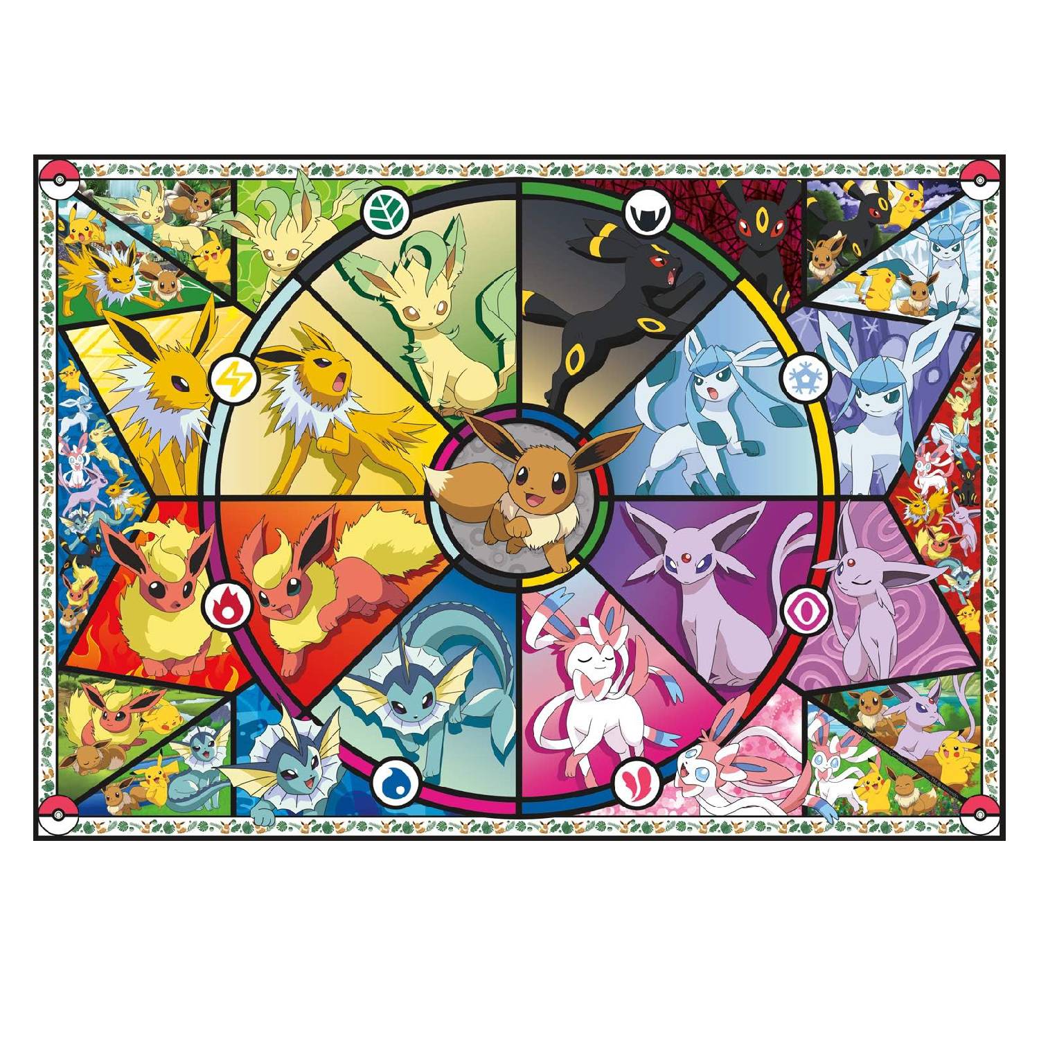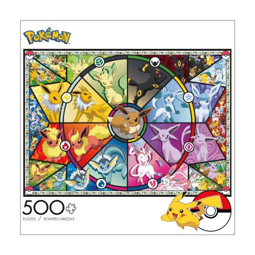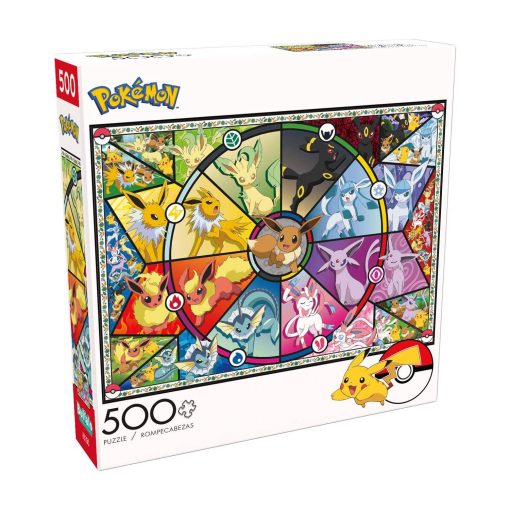 Este rompecabezas Pokémon de 500 piezas, titulado Eevee’s Stained Glass presenta un collage de Eevee y todas sus diferentes evoluciones!