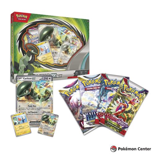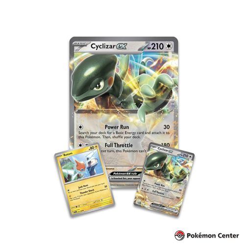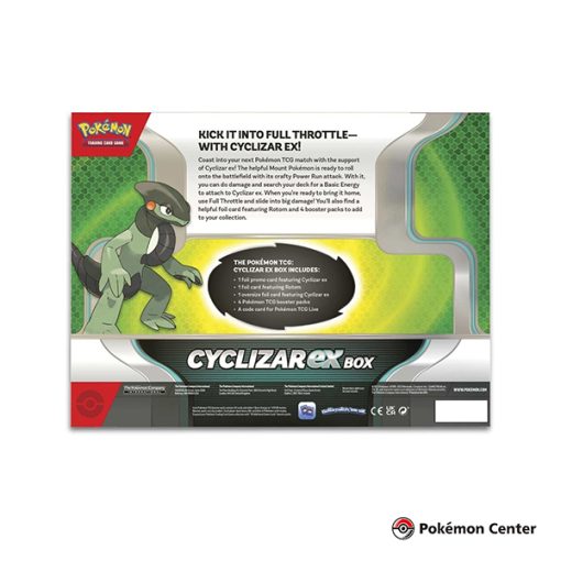 - ¡Lánzate a tu próxima partida de JCC Pokémon con el apoyo de Cyclizar ex! El útil Pokémon Mount está listo para rodar por el campo de batalla con su astuto ataque Power Run. Con él, puedes hacer daño y buscar en tu mazo una energía básica para unirla a Cyclizar ex. ¡Cuando estés listo para llevarlo a casa, usa Full Throttle y deslízate hacia un gran daño! También encontrarás una útil tarjeta de aluminio con Rotom y 4 paquetes de refuerzo para agregar a tu colección.