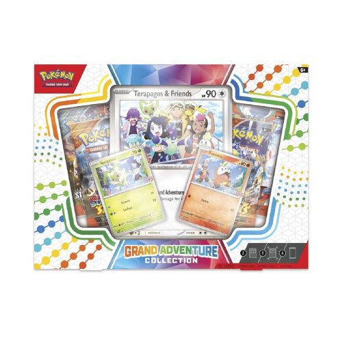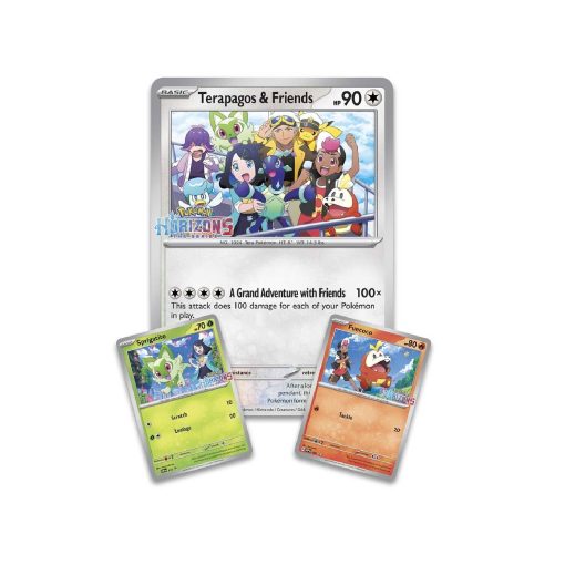 Si tienes un Pokémon a tu lado, ¡todo irá bien! Liko y Roy han recorrido un largo camino con sus compañeros Pokémon mientras se unen a Terapagos en la búsqueda del legendario paraíso de Laqua. Ahora puedes formar equipo con Sprigatito y Fuecoco como cartas promocionales jugables, junto con una carta promocional de gran tamaño de Terapagos y sus amigos para exhibir. Cada carta promocional presenta ilustraciones inspiradas en Pokémon Horizons: The Series . Para completar esta colección aventurera, ¡también obtienes cuatro paquetes de refuerzo de JCC Pokémon con aún más cartas geniales en su interior!