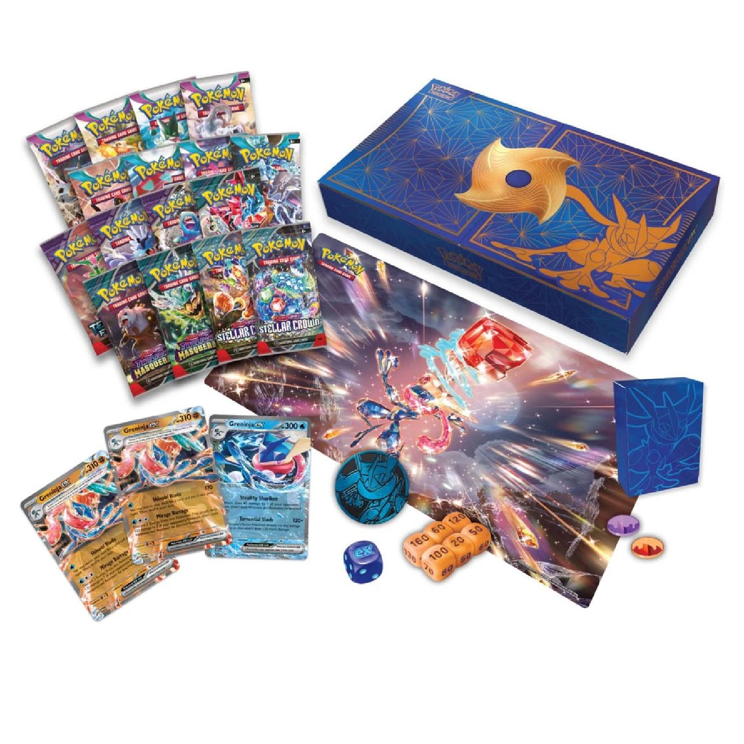 Este maravilloso Pokémon, normalmente de tipo Agua, protagoniza su propia Colección Ultra Premium como un Pokémon Tera ex de tipo Lucha. Usa Espada Shinobi para golpear fuerte y buscar cualquier carta en tu mazo, o ataca con Barrage Mirage y golpea la Banca del rival… ¡dos veces! Como corresponde a un Pokémon tan icónico, esta colección incluye a Greninja ex como carta jugable y como carta de metal coleccionable, una carta promocional con arte completo que presenta a Greninja ex, una gran cantidad de paquetes de mejora de JCC Pokémon, una caja de mazo y un tapete de juego, y mucho más.