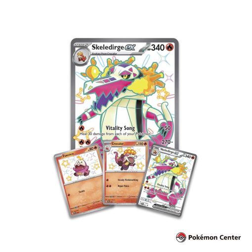 ¡Capturar un Pokémon Shiny siempre ha sido una hazaña rara, pero con esta colección puedes agregar tres de estos Pokémon con colores especiales a tu arsenal! Con su voz ardiente, Shiny Skeledirge ex posee tanto el poder de curar como el de destruir a través de sus dos ataques candentes. Shiny Fuecoco y Shiny Crocalor se unen al coro como cartas promocionales jugables, y puedes mostrar la cadena evolutiva completa en un protector magnético de 3 cartas. También encontrarás una carta de gran tamaño que presenta a Shiny Skeledirge ex, además de un montón de paquetes de refuerzo de la expansión Scarlet & Violet—Paldean Fates para seguir creciendo tu colección.