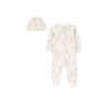 Gorro a Juego: El set incluye un gorro a juego, blanco y con el mismo estampado de animalitos. Además, está adornado con orejitas de oso, añadiendo un toque lúdico y adorable. Este gorro es perfecto para mantener la cabeza de tu bebé protegida del frío.