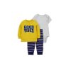Este encantador pack de ropa para bebé de la reconocida marca Carter’s incluye tres piezas fundamentales para cualquier recién nacido. El conjunto está compuesto por un body gris de manga corta, un pantalón azul marino con rayas blancas horizontales, y una polera amarilla de manga larga con la frase «GOOD VIBES» en azul, que resalta la alegría y energía de tu pequeño.